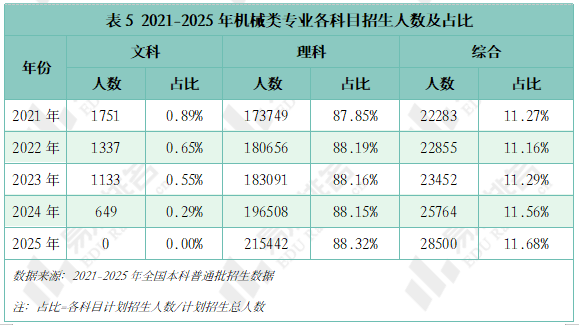 近五年机械类专业招收文科\汗青考生的打算数逐年递减,至2025年完全归零,理科、分析科目标招生人数趋于不变,可知本年招生打算削减的部门多来自文科\汗青科目。