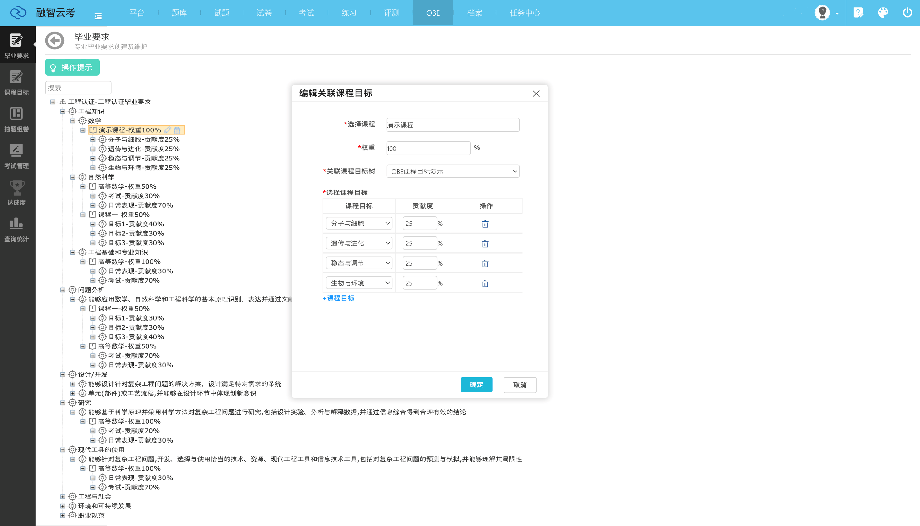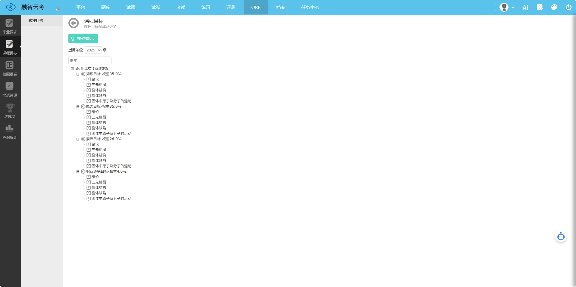 OBE讲授以“学生核心、导向、强调通过明白预期进修,反向设想课程系统取讲授方式。这一取我国工程教育认证尺度高度契合,已成为高校专业扶植的主要指南。融智云创软件无限公司的OBE处理方案笼盖了从专业扶植规划到课程方针告竣度阐发的全链条,通过数据驱动的体例帮帮高校实现讲授质量的可视化办理取动态优化。引入OBE讲授后,该专业通过度解结业要求目标点,沉构了32门焦点课程的讲授纲领,并操纵课程方针告竣度系统对每门课程的查核体例取内容进行了精准设想。实施一年后,学生工程实践能力评分提拔23%,用人单元对劲度达到95%,专业成功通过工程教育认证。